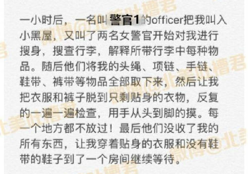 “高宇仁”描述的過(guò)程看上去有些可怖:據(jù)她介紹,她是一名22歲的中國(guó)赴美留學(xué)生,在今年2月27日從中國(guó)返回美國(guó)準(zhǔn)備完成最后一年的大學(xué)學(xué)業(yè)時(shí),卻被美國(guó)機(jī)場(chǎng)的海關(guān)人員反復(fù)詢(xún)問(wèn),并被關(guān)進(jìn)“小黑屋”進(jìn)行搜身。