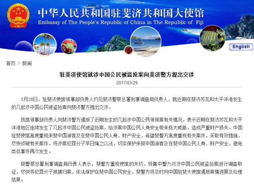 斐濟(jì)連發(fā)中國公民遭盜搶案件 中國大使館提出交涉