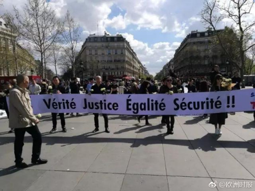 法國當(dāng)?shù)貢r間4月2日下午,在獲得法國政府預(yù)先批準(zhǔn)的情況下,數(shù)千位華人在巴黎共和廣場舉行合法集會,悼念被法國警察槍擊致死的旅法僑胞。