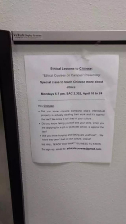 2日晚,有UT學(xué)生在工程學(xué)院院樓(ECJ)中發(fā)現(xiàn)有人張貼帶有辱華內(nèi)容的傳單。傳單內(nèi)容的標(biāo)題是“為中國(guó)人開設(shè)的道德課”,其中“中國(guó)人”下面還加了下劃線,正文則嘲笑中國(guó)學(xué)生打嗝、放屁,并影射中國(guó)學(xué)生在學(xué)術(shù)上抄襲,在學(xué)歷、求職中造假等,并標(biāo)注了這門“課程”“上課”的時(shí)間地點(diǎn)。在UT就讀的大四的中國(guó)留學(xué)生郭同學(xué)5日告訴《環(huán)球時(shí)報(bào)》記者,這樣的傳單當(dāng)晚就在UT的中國(guó)學(xué)生微信群中引起了“軒然大波”,大家都很生氣。