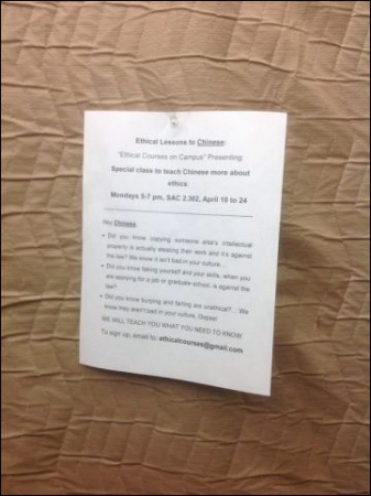 2日晚,有UT學(xué)生在工程學(xué)院樓中發(fā)現(xiàn)有人張貼帶有辱華內(nèi)容的傳單。傳單標(biāo)題是“為中國人開設(shè)的道德課”,其中“中國人”下面還加了下劃線。正文則嘲笑中國學(xué)生打嗝、放屁,并影射中國學(xué)生在學(xué)術(shù)上抄襲,在學(xué)歷、求職中造假等,并標(biāo)注這門“課程上課”的時(shí)間地點(diǎn)。