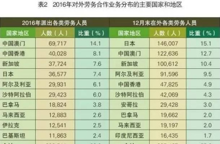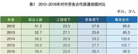 據(jù)商務(wù)部的統(tǒng)計(jì)數(shù)據(jù):2016年,我國(guó)對(duì)外勞務(wù)合作派出各類勞務(wù)人員49.4萬(wàn)人,較上年減少3.6萬(wàn)人;其中承包工程項(xiàng)下派出23萬(wàn)人,勞務(wù)合作項(xiàng)下派出26.4萬(wàn)人。12月當(dāng)月,派出各類勞務(wù)人員6萬(wàn)人,較上年增加0.2萬(wàn)人。年末在外各類勞務(wù)人員96.9萬(wàn)人,較上年減少5.8萬(wàn)人。