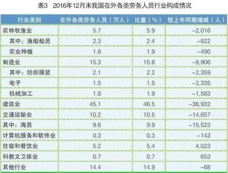 在2016年12月末時(shí),出國(guó)務(wù)工人員的所在行業(yè)構(gòu)成情況: