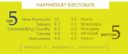 三大城市中,惠靈頓的移民幸福感最高為7.9,奧克蘭次之7.3,Christchurch6.9。從選取來(lái)看,New Plymouth的移民幸福指數(shù)達(dá)到10,幸福到不能再幸福了!而幸福感最低的5個(gè)選區(qū),分別為Nelson,MtRoskill,Mangere,Wairarapa,和Mana。
