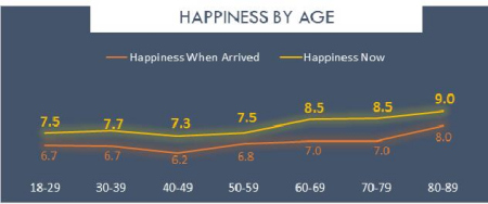 從年齡來(lái)看,年齡越大的移民越幸福,80-90歲年齡段的人幸福感達(dá)到9。報(bào)告指出,老一代的移民在技術(shù)和適應(yīng)環(huán)境的態(tài)度上都要更好,老移民應(yīng)該多帶一帶年輕一輩。