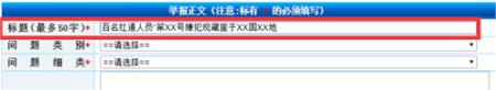 首先,填寫舉報(bào)標(biāo)題。提綱挈領(lǐng),概括您要舉報(bào)的問題,把關(guān)鍵信息亮在標(biāo)題里,一目了然即可,不超過50字。