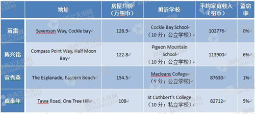 這還不是最夸張的。以上四人所住的街區(qū),房屋均價(jià)全部超過(guò)100萬(wàn)。其中宣秀英所在的The Esplanade是奧克蘭東區(qū)Eastern Beach的一條著名海濱大道,全部都是“面朝大海春暖花開(kāi)”的海景豪宅。2017年的市場(chǎng)均價(jià)在155萬(wàn)紐幣(約合775萬(wàn)人民幣)。