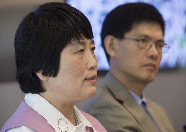 2015年9月15日,郗小星(右)和陳霞芬就檢察官撤銷(xiāo)指控一事在華盛頓舉行了記者會(huì)。(法新社)