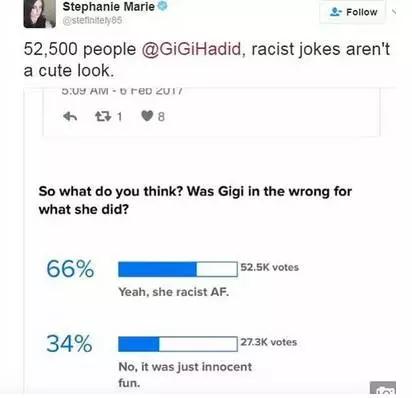 Twitter上一項(xiàng)超過52000人參與的調(diào)查顯示:66%的受訪者認(rèn)為這樣的行為就是種族歧視。