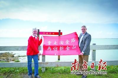 羅布地區(qū)市長彼得·萊斯利(左)與羅布地區(qū)議會主席羅杰·斯威特曼在“友誼之門”展開南方日報“重走淘金路 再訪新金山”的旗幟。
