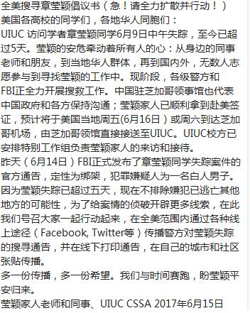 在一個(gè)名為“尋找章瑩穎-媒體組”的微信群里,章瑩穎的母校北大的UIUC(伊利諾伊州大學(xué)香檳分校)校友會(huì)主席宋翔宇發(fā)出了一封“全美搜尋章瑩穎”的倡議書。并呼吁媒體、尤其是北美華文媒體對(duì)此進(jìn)行轉(zhuǎn)發(fā),“這是我們現(xiàn)階段能為瑩穎做的事情?!?/p>