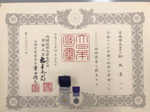 2017年4月29日,日本天皇正式授予陳熹紺綬褒章和獎狀,獎狀上寫著“日本天皇授予為公益捐獻多額私財?shù)乃邵嘞惨唤C綬褒章”,上蓋極為少見的日本國璽。