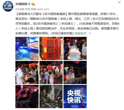 據(jù)中國駐泰國使館透露,昨晚11點(diǎn)半,普吉芭東一輛載有32名中國游客(來自上海、湖北、江蘇)的大巴車疑因剎車失靈導(dǎo)致翻車,致2名中國游客死亡(來自湖北),24名游客不同程度受傷,目前6人(來自上海)需住院觀察治療,無生命危險(xiǎn),其余游客已出院。使館要求泰方妥善處理,徹查事故原因。(央視記者陳林聰)