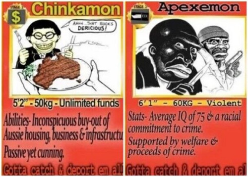 據(jù)香港東網(wǎng)11日報道,10日早上,這些模擬Pokémon GO游戲卡的海報出現(xiàn)在悉尼馬里克維爾(Marrickville)街頭,其中一張是一個丑化華人形象的人,手拿刀叉對著一張澳大利亞地圖形狀的牛排咧嘴大笑。在海報下則有數(shù)行文字寫著“擁無限資金”,以及“技能:在澳洲肆意買房屋和基礎設施,順從但非常狡猾”,似在諷刺中國人近年在澳洲大舉投資,拉高房價。海報上還寫有“抓住他們,將他們?nèi)框?qū)逐出境”的字樣。