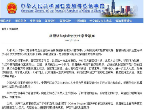 中國駐芝加哥總領(lǐng)館繼續(xù)密切關(guān)注章瑩穎案