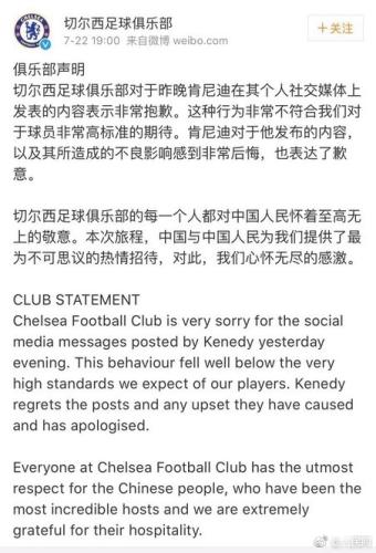 作為球隊(duì),切爾西22日也通過其官方微博發(fā)表聲明表示道歉,“切爾西足球俱樂部對(duì)于昨晚肯尼迪在其個(gè)人社交媒體上發(fā)表的內(nèi)容表示非常抱歉。這種行為非常不符合我們對(duì)于球員非常高標(biāo)準(zhǔn)的期待??夏岬蠈?duì)于他發(fā)布的內(nèi)容,以及其所造成的不良影響感到非常后悔,也表達(dá)了歉意。切爾西足球俱樂部的每一個(gè)人都對(duì)中國(guó)人民懷著至高無上的敬意。本次旅程,中國(guó)與中國(guó)人民為我們提供了最為不可思議的熱情招待,對(duì)此,我們心懷無盡的感激。”
