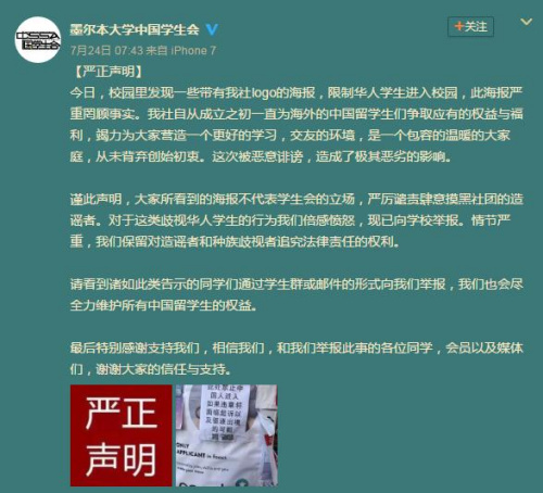 從圖片上可以看到,公告的右上角是墨爾本大學(xué)的標(biāo)識(shí),而下方卻是“墨大中國(guó)學(xué)生會(huì)CSSA”的標(biāo)識(shí)。這難道是中國(guó)人在黑自己人?記者在微博上搜索到“墨大中國(guó)學(xué)生會(huì)”的官方賬號(hào),發(fā)現(xiàn) “中國(guó)學(xué)生會(huì)”已經(jīng)針對(duì)此事發(fā)布微博,進(jìn)行了澄清。