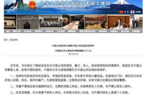 中國駐日大使館提醒加強(qiáng)自我保護(hù)