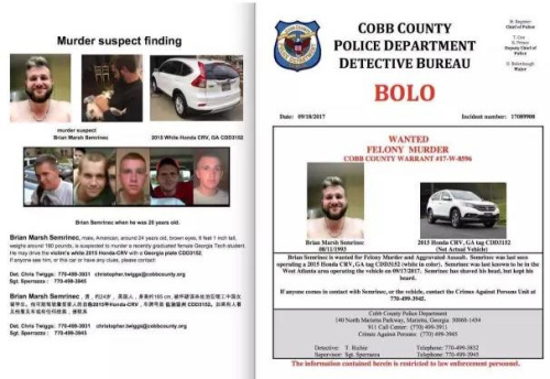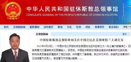 據(jù)中國駐休斯敦總領(lǐng)館網(wǎng)站消息,美國中部時間2017年9月25日,美國佐治亞州科伯郡警察局向中國駐休斯敦總領(lǐng)館通報,涉嫌日前在該郡殺害一名女性中國公民的嫌犯于當(dāng)?shù)貢r間9月25日下午被警方逮捕。