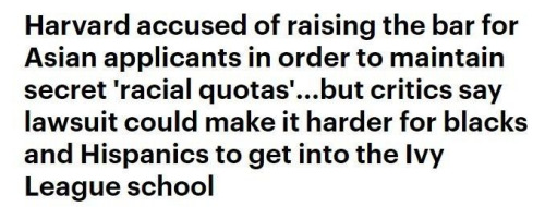 往往,其他族裔的申請人能夠以比亞裔更低的成績獲得錄取。2014年,哈佛就因為這個政策而被指控歧視亞裔學生。