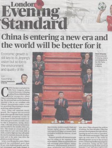 中新網(wǎng)倫敦11月3日電 (記者 張平)英國主流媒體《旗幟晚報》3日在紙質(zhì)版和網(wǎng)絡(luò)版同時刊登中國駐英國大使劉曉明的署名文章《進(jìn)入新時代的中國將給世界帶來更多福祉》。