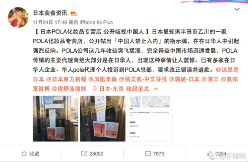 【中國人禁止入內(nèi)!!!】據(jù)日本美食資訊微博,日本愛知県半田市乙川的一家POLA化妝品專營店,公開貼出“中國人禁止入內(nèi)”的指示牌,此舉在在日華人中引起強(qiáng)烈反響。POLA寶麗是創(chuàng)立于日本靜岡的品牌,在日本被譽(yù)為“化妝界四大花旦之一”,昨日(25日)就此事做出回應(yīng)。