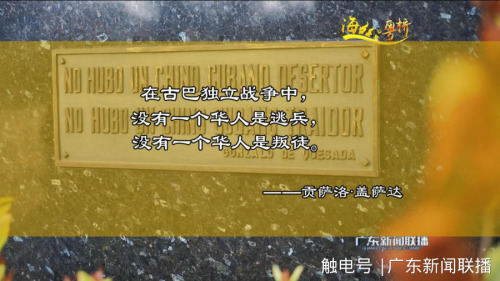 在蔣老先生的指引下,我們來(lái)到哈瓦那海濱大道街心花園。一座黑色大理石紀(jì)念碑靜靜地佇立在花園里,上面刻著古巴獨(dú)立戰(zhàn)爭(zhēng)時(shí)期的將軍貢薩洛·蓋薩達(dá)的一句話:“在古巴獨(dú)立戰(zhàn)爭(zhēng)中,沒(méi)有一個(gè)華人是逃兵,沒(méi)有一個(gè)華人是叛徒?!惫虐腿嗣駥?duì)獨(dú)立戰(zhàn)爭(zhēng)中華人的英雄行為和高尚品質(zhì)非常崇敬,于是建立“華人記功碑”以紀(jì)念華人所做的巨大貢獻(xiàn)。(來(lái)源:廣東廣播電視臺(tái)“觸電新聞”客戶端)