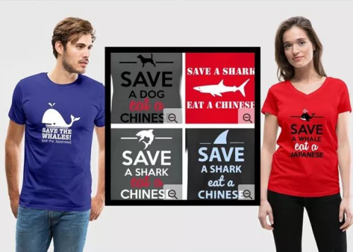 這家德國(guó)公司被指涉嫌種族歧視的多款T恤,上面印著“救一只狗,吃一個(gè)中國(guó)人”(Save A Dog, Eat A Chinese)、“救一條鯊魚(yú),吃一個(gè)中國(guó)人”(Save A Shark, Eat A Chinese),每件售價(jià)25.39歐元。