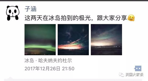 2017年12月26日,子涵在朋友圈和大家分享絢麗的極光。