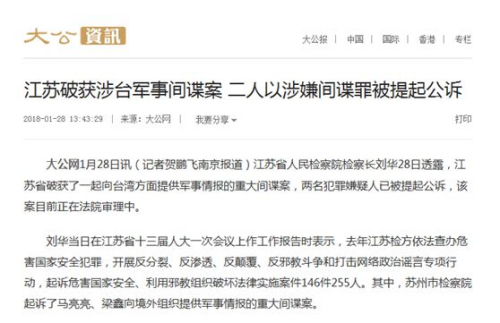 【環(huán)球網(wǎng)綜合報(bào)道】據(jù)香港大公網(wǎng)1月28日報(bào)道,江蘇省人民檢察院檢察長劉華28日透露,江蘇省破獲了一起向臺灣方面提供軍事情報(bào)的重大間諜案,兩名犯罪嫌疑人已被提起公訴,該案目前正在法院審理中。