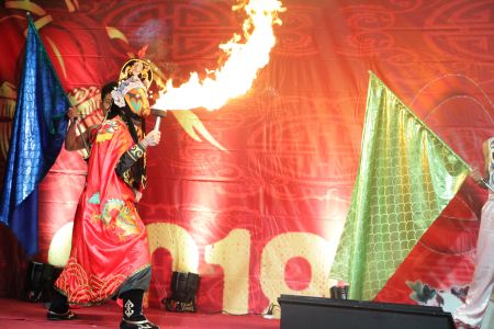 如果說總局大禮堂的聯(lián)歡會以“狗年”為重要元素,在網(wǎng)球俱樂部的新春晚宴節(jié)目則凸顯了中華文化的博大精深及獨特魅力。川劇變臉、噴火、長嘴壺茶藝、中國功夫應(yīng)有盡有,不僅讓現(xiàn)場的華裔目瞪口呆,許多生于中國、長于中國的觀眾也表示是第一次現(xiàn)場看到。