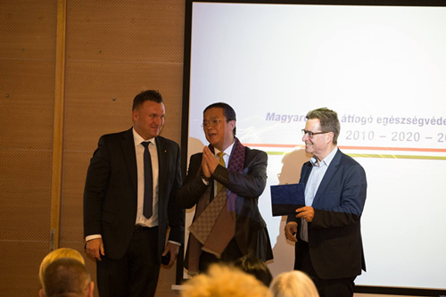 大會期間,歐盟國民健康檢查計劃委員會主席Dankovics先生和委員會秘書長Barna教授為陳震博士頒發(fā)了“杰出社會貢獻獎”,感謝陳博士多年來參與國民健康檢查計劃,為匈牙利國民提供了切實可行的中醫(yī)藥防病治病理念和措施,為千家萬戶帶來健康的生活理念。