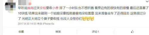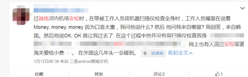 經(jīng)緯君在微博上搜索發(fā)現(xiàn),很多人都有被越南海關(guān)以及安檢人員索要小費(fèi)的遭遇,有人在微博中寫到,在河內(nèi)機(jī)場過安檢時(shí),工作人員嘴里一直念著“money money money”,而自己說了是來自韓國則可以順利過關(guān)。