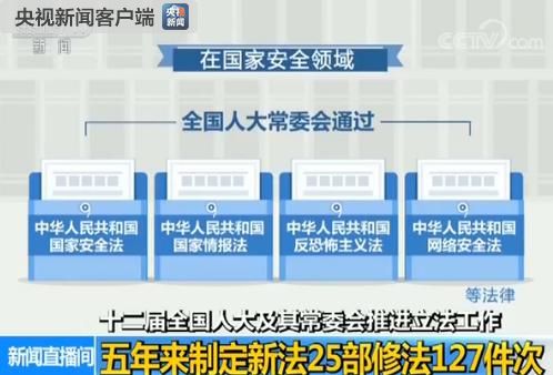 五年以來,十二屆全國人大及其常委會不斷加強和改進立法工作,扎實推進重點領(lǐng)域立法。在國家安全領(lǐng)域,全國人大常委會通過了《國家安全法》、《國家情報法》、《反恐怖主義法》、《網(wǎng)絡(luò)安全法》等法律。