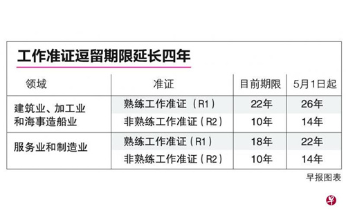 雖然薪金門檻沒有調(diào)整,不過政府將延長工作準(zhǔn)證持有者的逗留期限,各領(lǐng)域都延長四年,在今年5月1日生效。