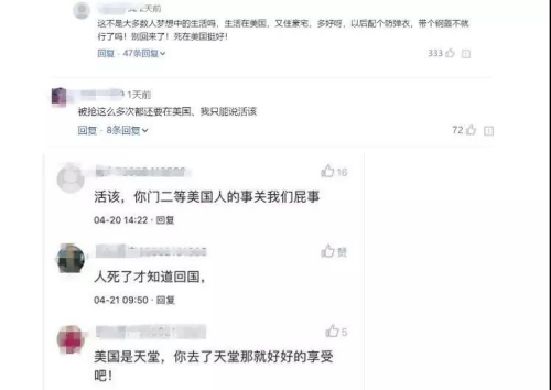 其實,類似的事情在網(wǎng)絡上早已司空見慣。似乎每發(fā)生一次華人受辱受害事件,總能為屏幕另一端的“鍵盤俠”們帶去“狂歡”。來看下面這些事例——