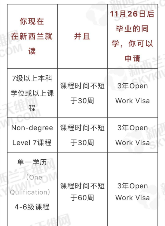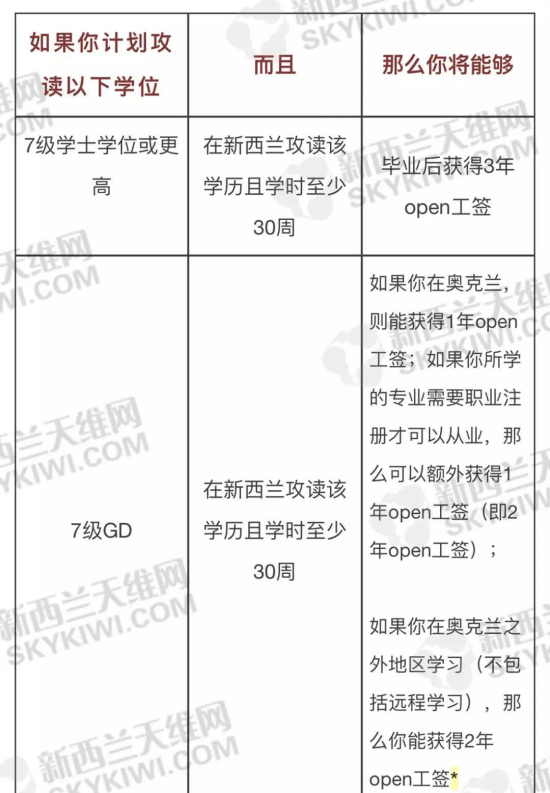 取消所有級(jí)別課程的留學(xué)生申請(qǐng)雇主擔(dān)保工簽的權(quán)利;為L(zhǎng)evel 4-6和non-degree Level 7課程的學(xué)生提供為期1年的open工簽;另外,為那些就讀GD且所學(xué)專業(yè)需要職業(yè)注冊(cè)才可以從業(yè)的畢業(yè)生,額外提供1年open工簽;為奧克蘭地區(qū)之外、且在2021年12月前完成學(xué)業(yè)的Level 4-6和non-degree Level 7課程的學(xué)生提供為期2年的open工簽;為L(zhǎng)evel 7學(xué)士學(xué)位及以上課程的學(xué)生提供為期3年的open工簽;8級(jí)課程留學(xué)生的專業(yè)需屬于長(zhǎng)期緊缺職業(yè),才能有資格擔(dān)保其配偶申請(qǐng)open工簽,以及其未成年子女免費(fèi)讀書。
