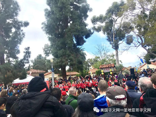 周六早上第一場活動,是在有著百年歷史的著名的圣地亞哥巴博哇公園(Balboa Park)內(nèi)。在中國館(House of China)附近的草坪上圍滿了一圈又一圈的人們,觀看由圣地亞哥孔子學院組織安排的春節(jié)文藝表演。人們興高采烈地觀看了由當?shù)匕图{德小學、河景小學、愛德小學、圣地亞哥少林寺武館以及孔子學院師生等表演的舞獅、歌舞、功夫、氣功、中國器樂等25個節(jié)目。游園會還擺開許多中國小吃和中國文化藝術品展銷,當天的中國春節(jié)慶?;顒邮艿接慰偷臍g迎。