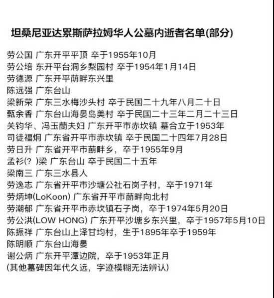 以下是安葬在坦桑尼亞達累斯薩拉姆華人公墓內(nèi)的逝者名單。截至目前,除了勞潮郁的消息有了些許眉目,其余的都未能找到。