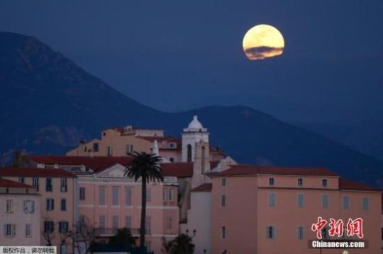 資料圖:一輪“超級月亮”在法國地中??莆骷螎u的阿雅丘上空升起。