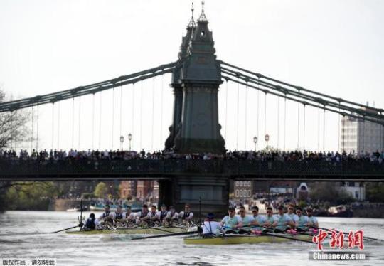 資料圖:當(dāng)?shù)貢r間2017年4月2日,2017年牛津劍橋賽艇對抗賽在英國倫敦泰晤士河上舉行。