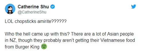 隨后這則廣告視頻被一位韓裔新西蘭人轉(zhuǎn)發(fā)到推特上,漢堡王在廣告中取笑筷子的行為令許多網(wǎng)友感到憤怒。筷子是亞洲各民族數(shù)千年來一直使用的一種餐具。世界各地的亞洲社區(qū),都用筷子吃飯。外國(guó)網(wǎng)友紛紛指責(zé)漢堡王“對(duì)文化不敏感”和“種族歧視”,還有一些人稱該廣告讓筷子看起來“笨拙”、“低級(jí)”和“愚蠢”。