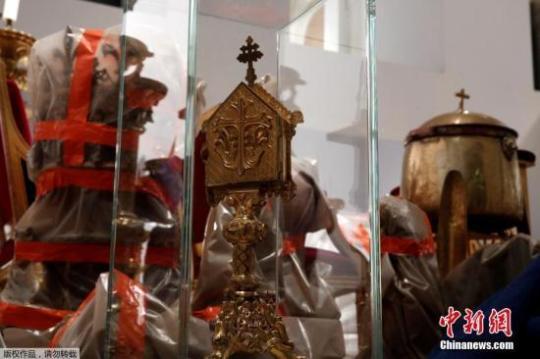 當(dāng)?shù)貢r(shí)間4月15日晚,法國(guó)著名的巴黎圣母院起火。在大火中,大教堂著名的尖塔墜落,內(nèi)部損傷嚴(yán)重。據(jù)外媒最新消息稱,除巴黎圣母院祭壇和十字架外,還包括荊棘王冠在內(nèi)的部分珍貴文物獲救。圖為媒體在巴黎市政廳的一個(gè)房間內(nèi)看到巴黎圣母院的珍寶。