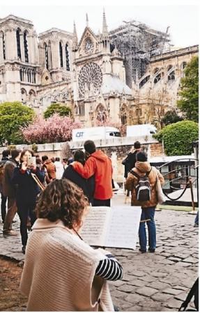 4月16日,一名少女在失火后的巴黎圣母院前演奏。