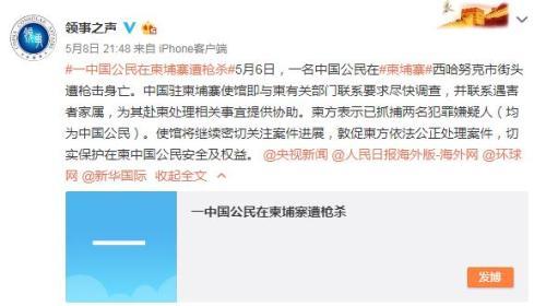 中國(guó)公民在柬埔寨遭槍擊身亡 柬方逮捕兩名嫌疑人