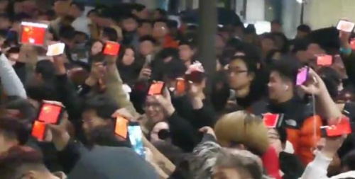 華僑華人和留學(xué)生們舉起手機(jī)、平板屏幕上的國旗點(diǎn)亮了雨夜。