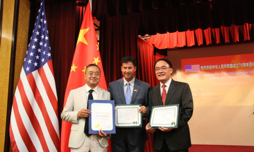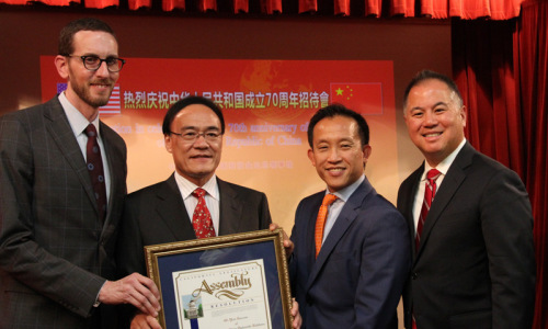 王東華總領(lǐng)事接受加州議會(huì)紀(jì)念中美建交40周年議案 駐舊金山總領(lǐng)館供圖