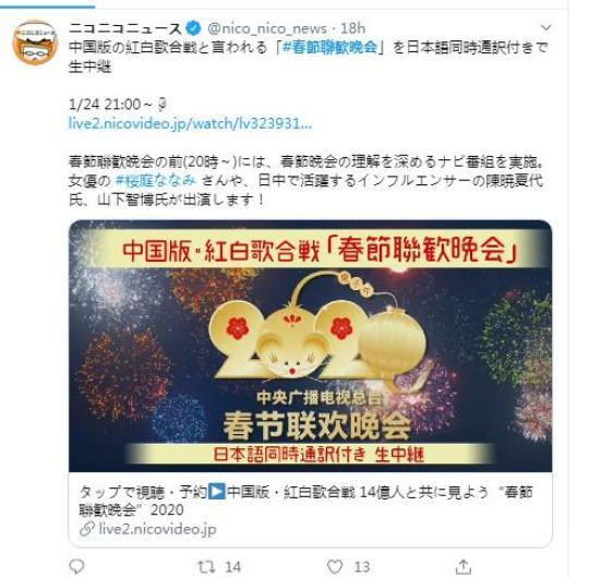 2020年1月24日晚,日本將在線直播中國春晚。來源:日本視頻網(wǎng)站niconico官方社交媒體賬戶截圖_副本