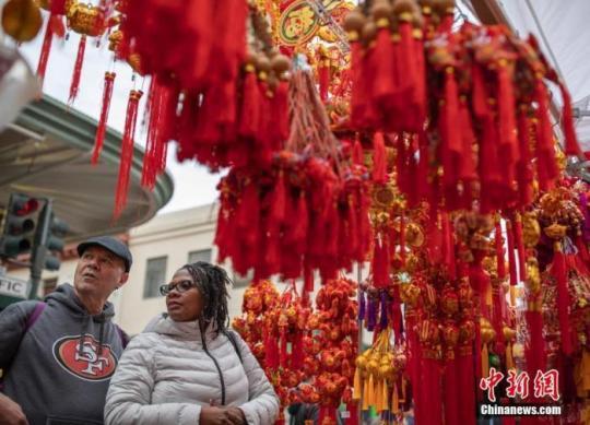 市民在舊金山“中國城”的春節(jié)花市上被各種飾品吸引。中新社記者 劉關(guān)關(guān) 攝