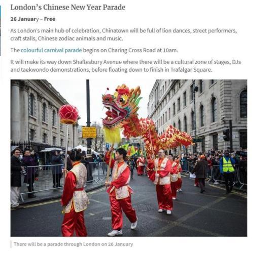 英國倫敦將于1月26日舉行舞龍舞獅的街頭表演。來源:英國metro都市地鐵報紙網(wǎng)站報道截圖
